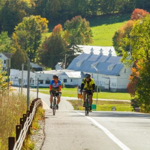 Top: Bike the Barns riders pass by Donnelly’s Farm and ice cream stand as they climb Harrietstown Hill outside of Saranac Lake, NY.