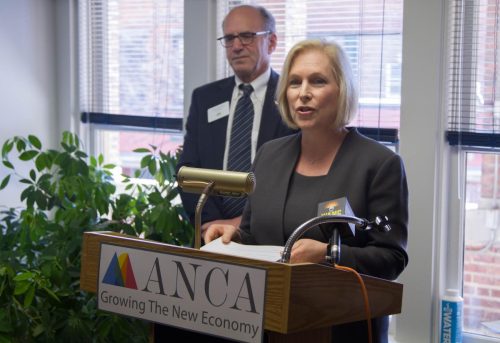 Photo: U.S. Senator Kirsten Gillibrand addresses members of the press and local and regional organizations at the ANCA office on May 7th.