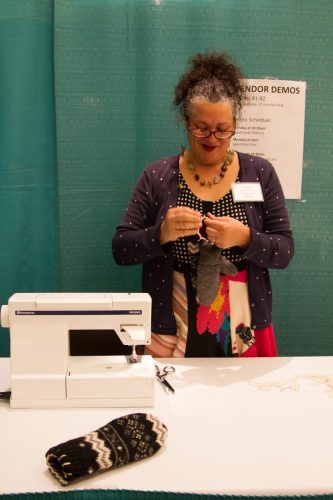Above: Charlotte Besaw, owner of HandCandy Mittens, demonstrates how she makes mittens from upcycled materials at the 2017 Adirondack Buyer Days show.