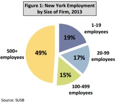 A 2015 report by the Office of Advocacy of the U.S. Small Business Administration (SBA) describes how important small businesses are to New York State’s economy. Keeping in mind that the report’s definition of “small business” is a firm with fewer than 500 employees, the federal analysis notes that small businesses make up over 99% of employers and account for over two million businesses statewide. When we break it down further, we see that 51% of New York’s small businesses employ between one and 100 people and nearly 20% employ fewer than 20 people. Additionally, there are over 1.6 million self-employed small business owners who do not employ hired help.