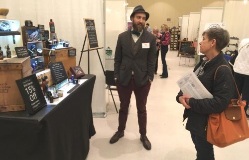 Above: Adam Cresko of Roosevelt Grooming Company speaks with buyer Aubra Herman of New York Makers at the 2017 Adirondack Buyer Days show in Saratoga Springs, NY.